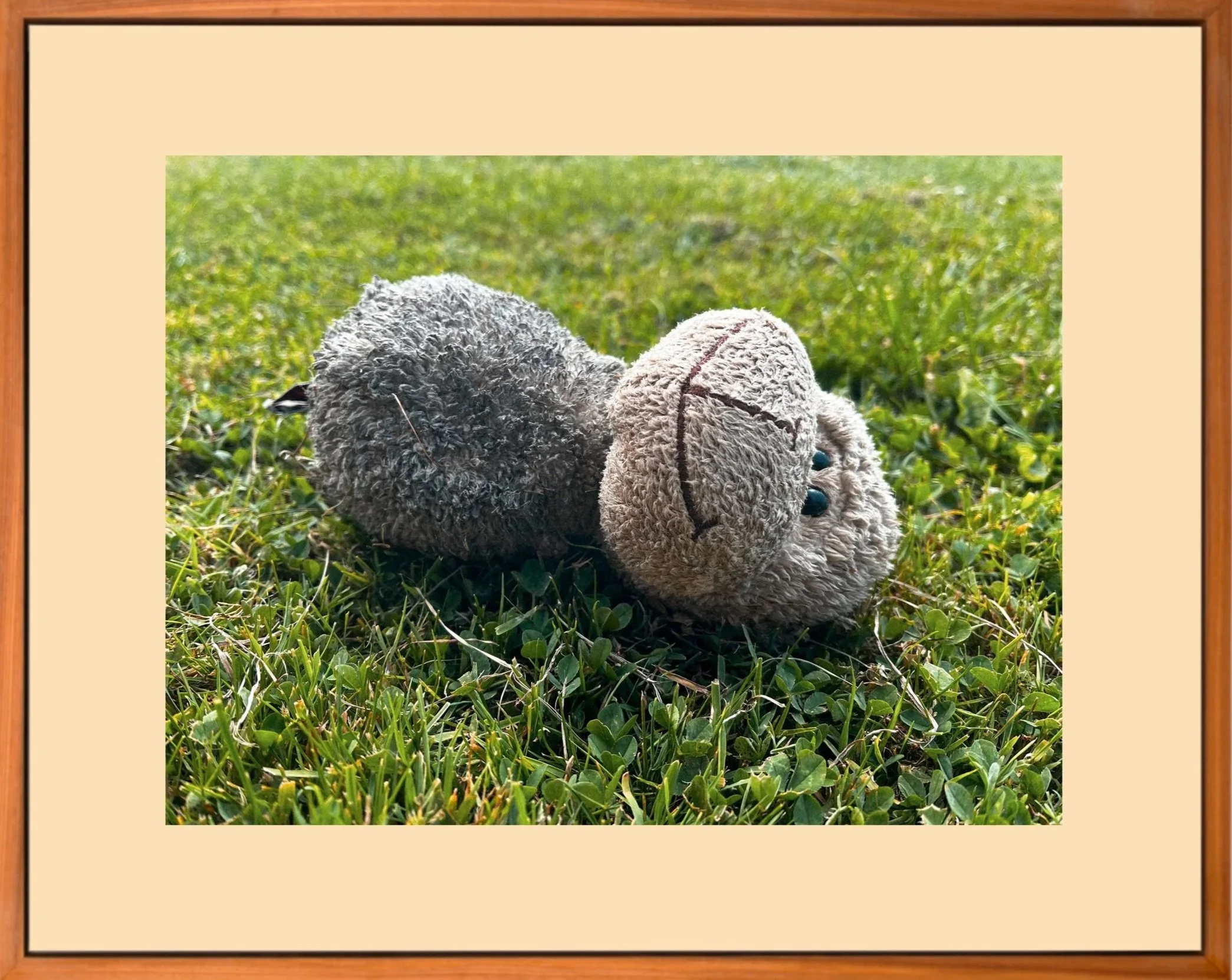Featuring my Border Collie’s toy lamb, now missing its arms, legs and ears, it sits on the neatly trimmed garden grass, sewn smile intact. This compromised form holds quiet discontent: Bruno’s innate needs, left unmet by this substitute. Just as Bruno’s instincts are only partially satisfied, I too wrestle with the shift from what once was to what now is.